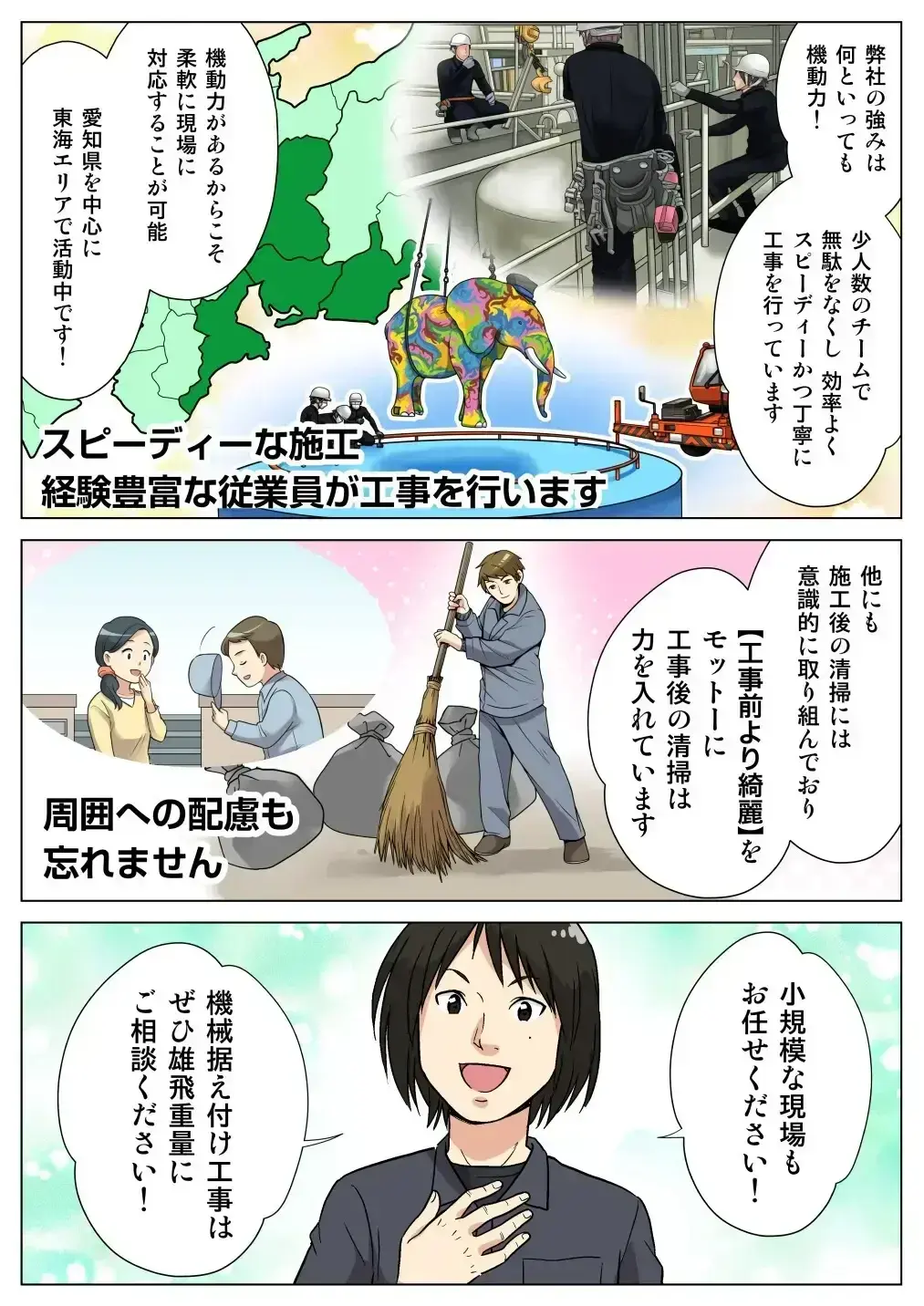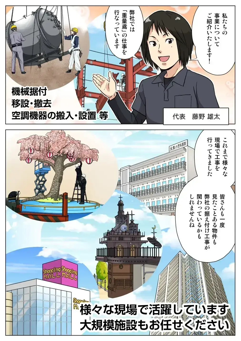 重量物の機械据え付けや空調関係の機械設置をメインとして、丁寧な作業で「重量とび」の仕事をします。比較的従業員の年齢が若く、少人数で機動力を持って施工しているため、スピーディーで無駄のない施工ができます。清掃も徹底しており、周囲への配慮を怠りません。