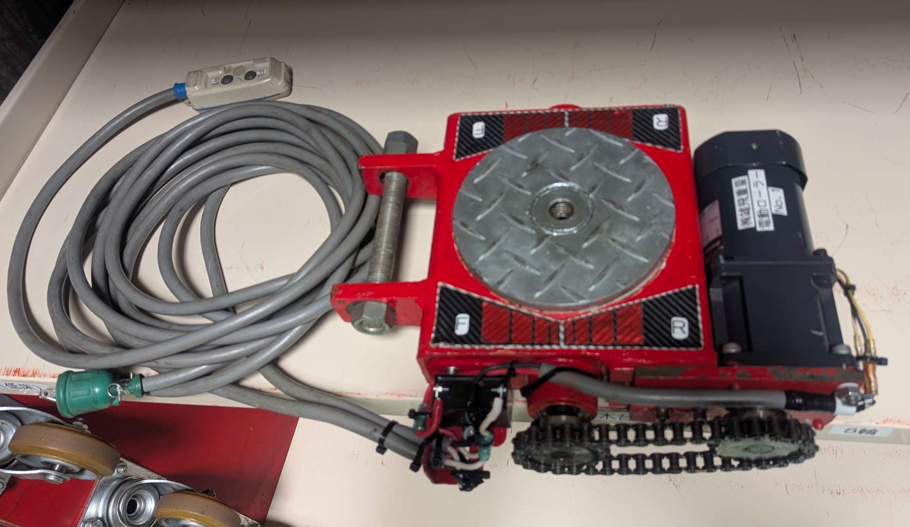 重量仕事には欠かせないチルローラーですが、今までは動かすためにウインチやチルホールと言った道具を使用しての作業が多かったのですが、色んな経験を積んできた社長が他社さんのアイデアを取り入れて、自社製作した電動チルローラー。