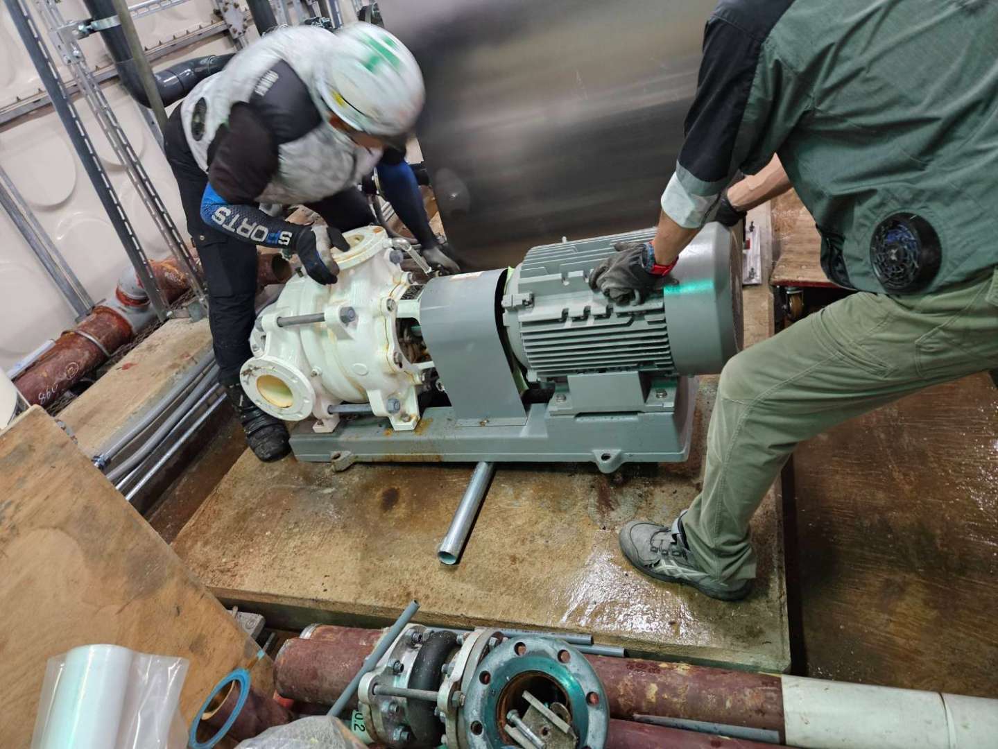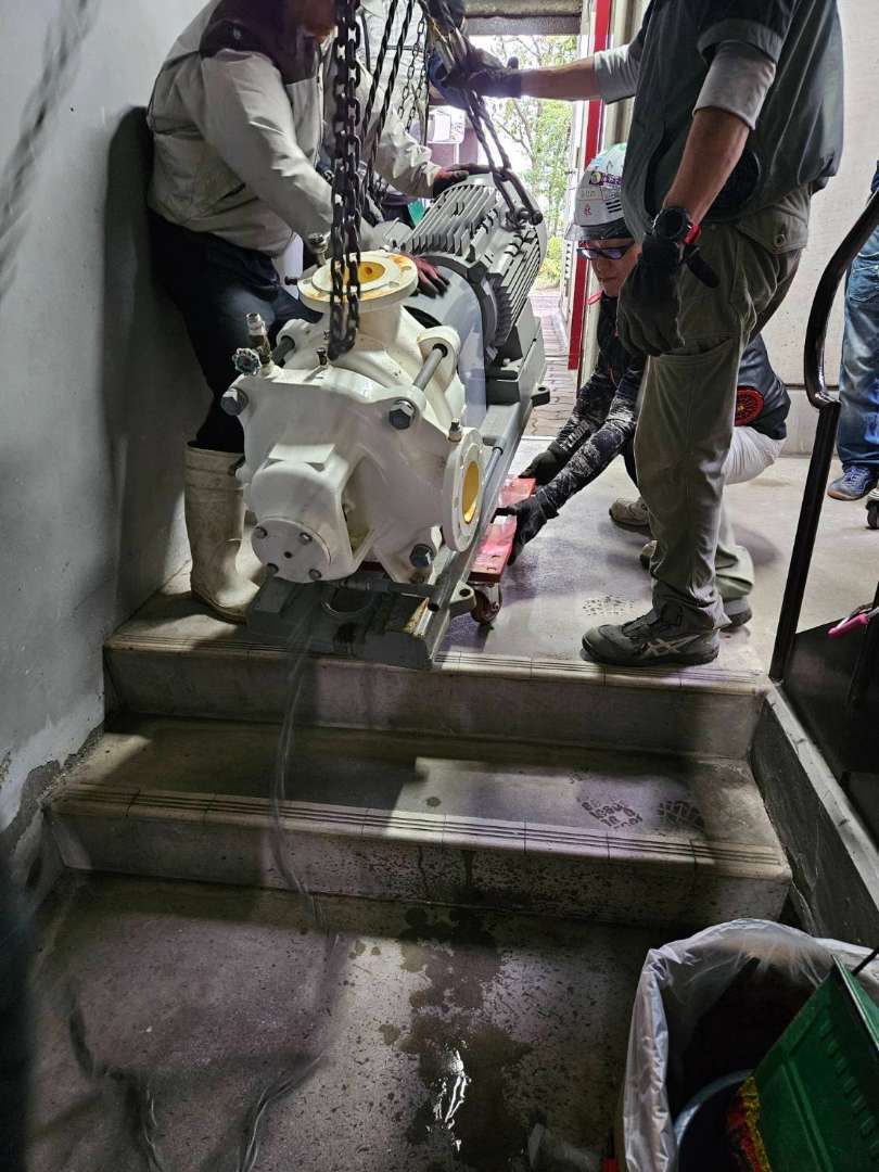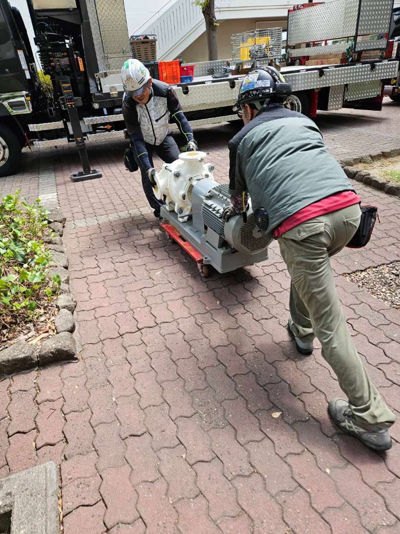 200kg程のポンプを迅速かつ安全に、しかも、既設物を傷つけることなく、全員で現場各人、危険個所の洗い出し、作業手順をしっかり確認して、事故もなく、無事に入れ替え作業を完了しました
