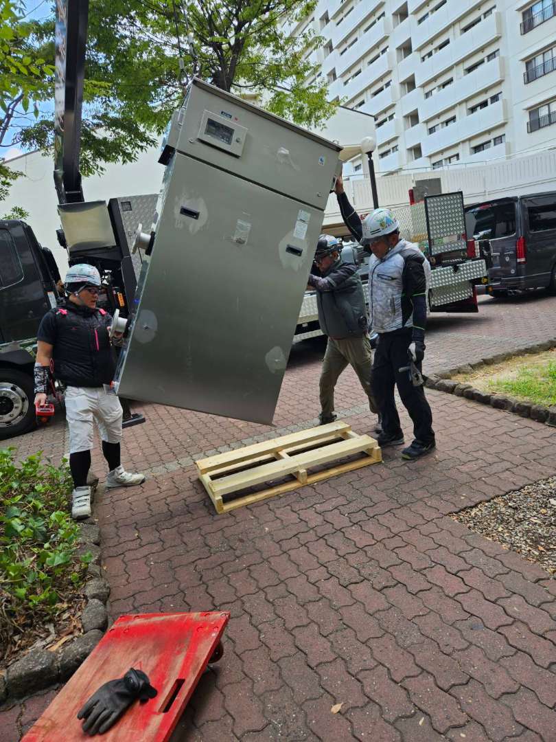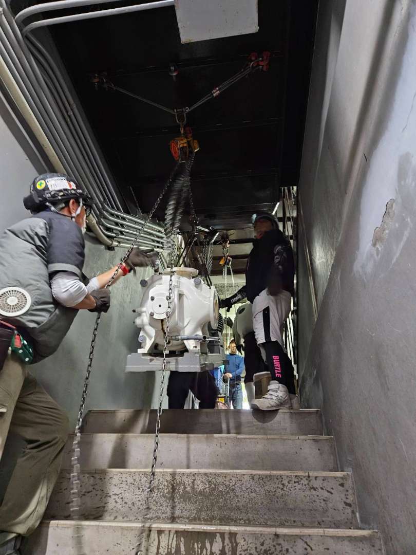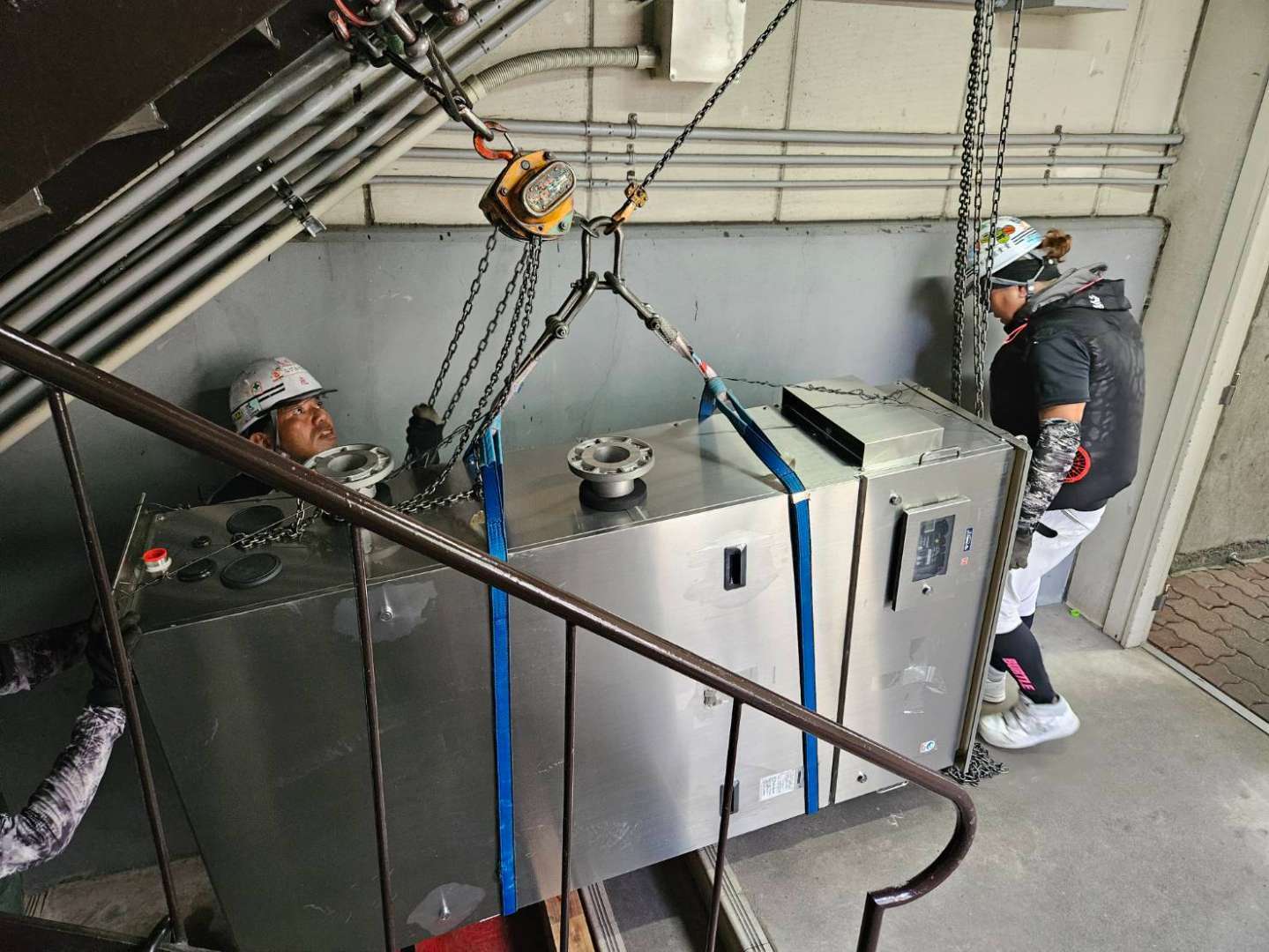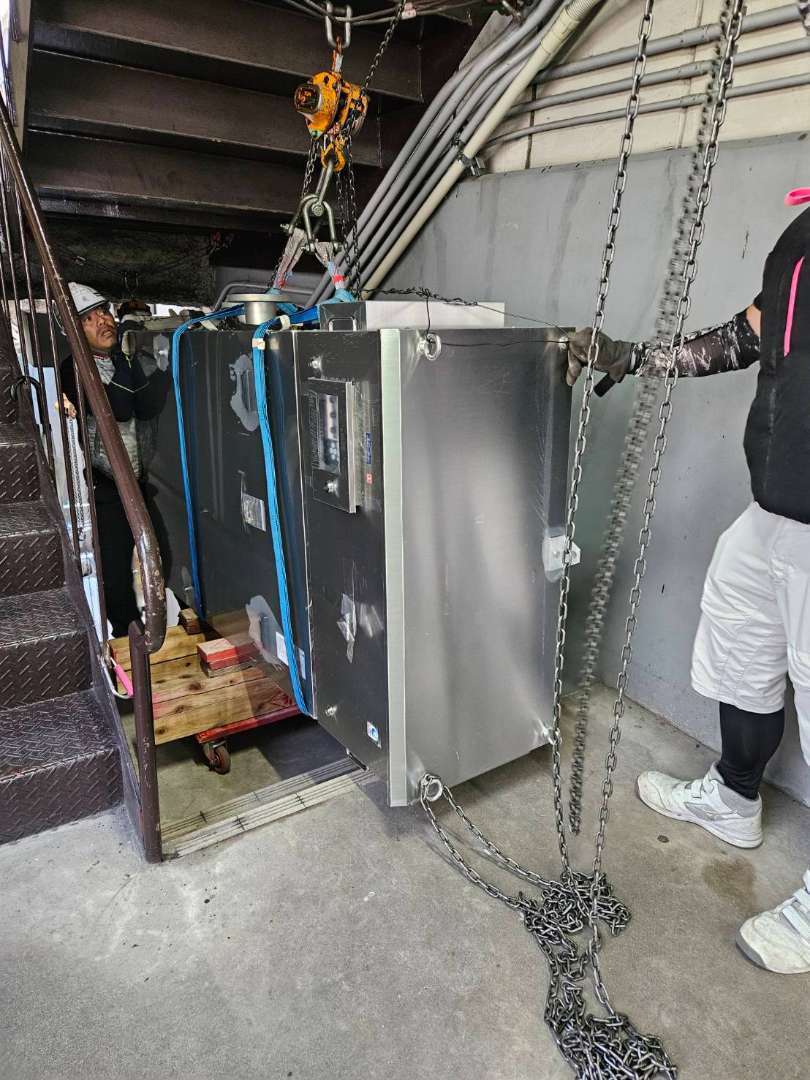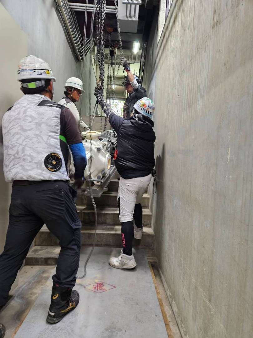 機械室が地下にあり、尚且つ、搬入出ルートが階段しか無いため、チェーンブロックを数丁使用しての吊り取り作業が発生する作業でした。