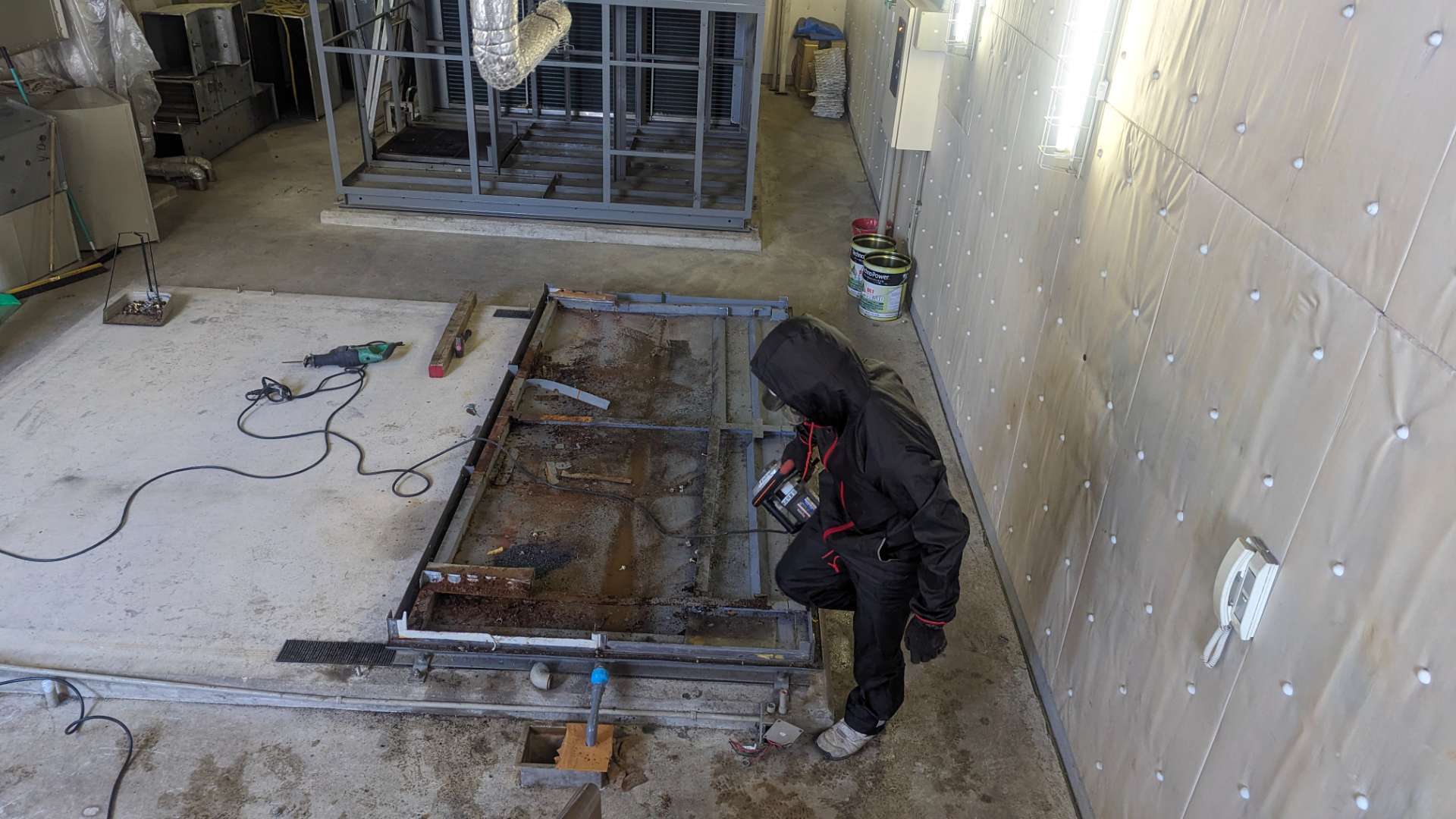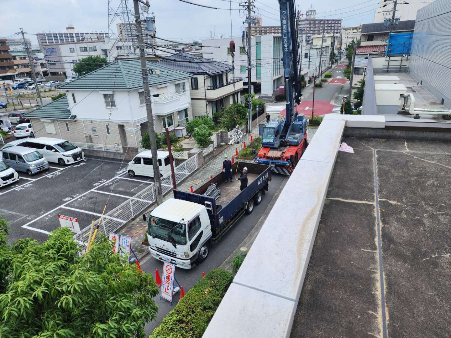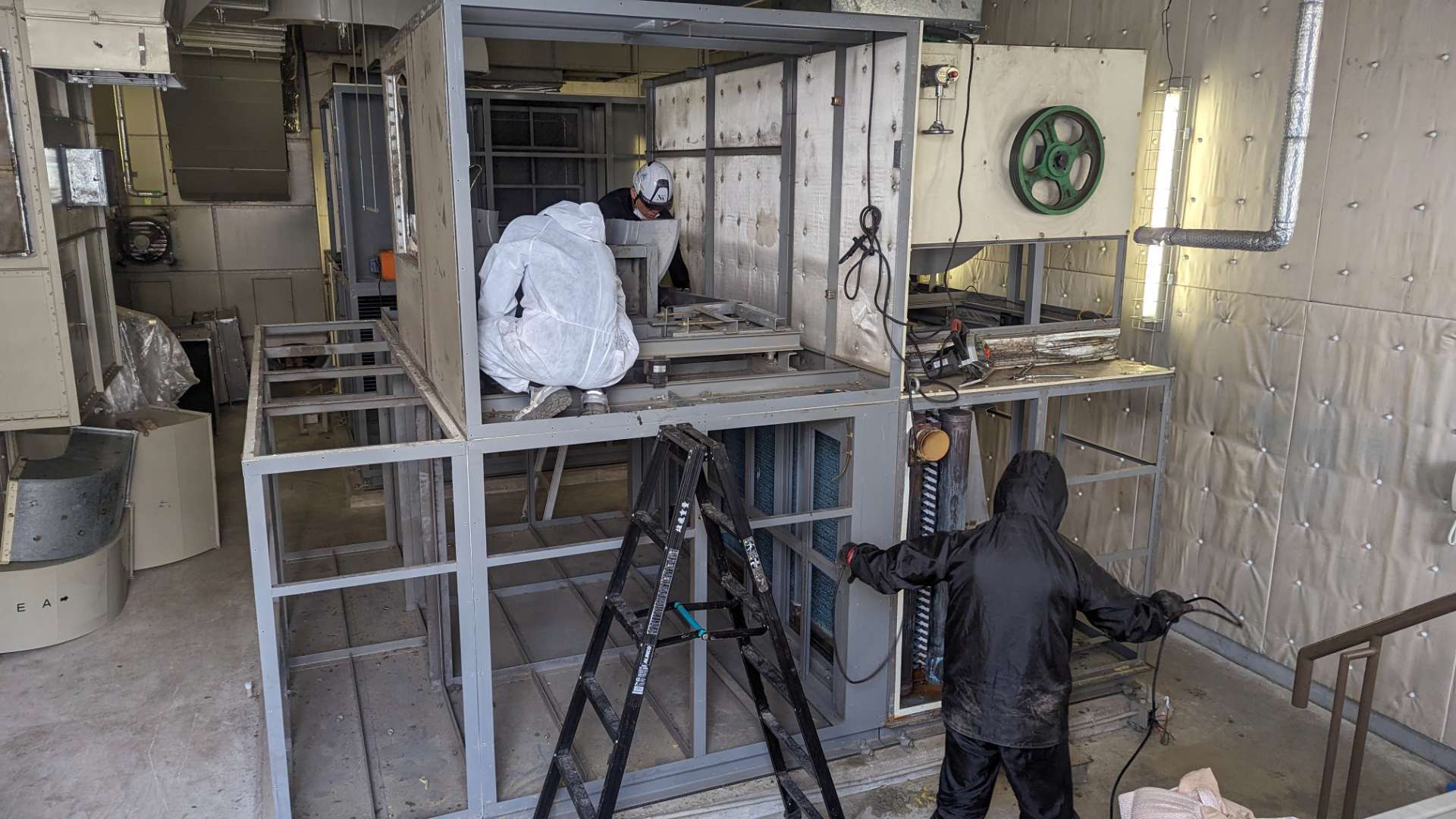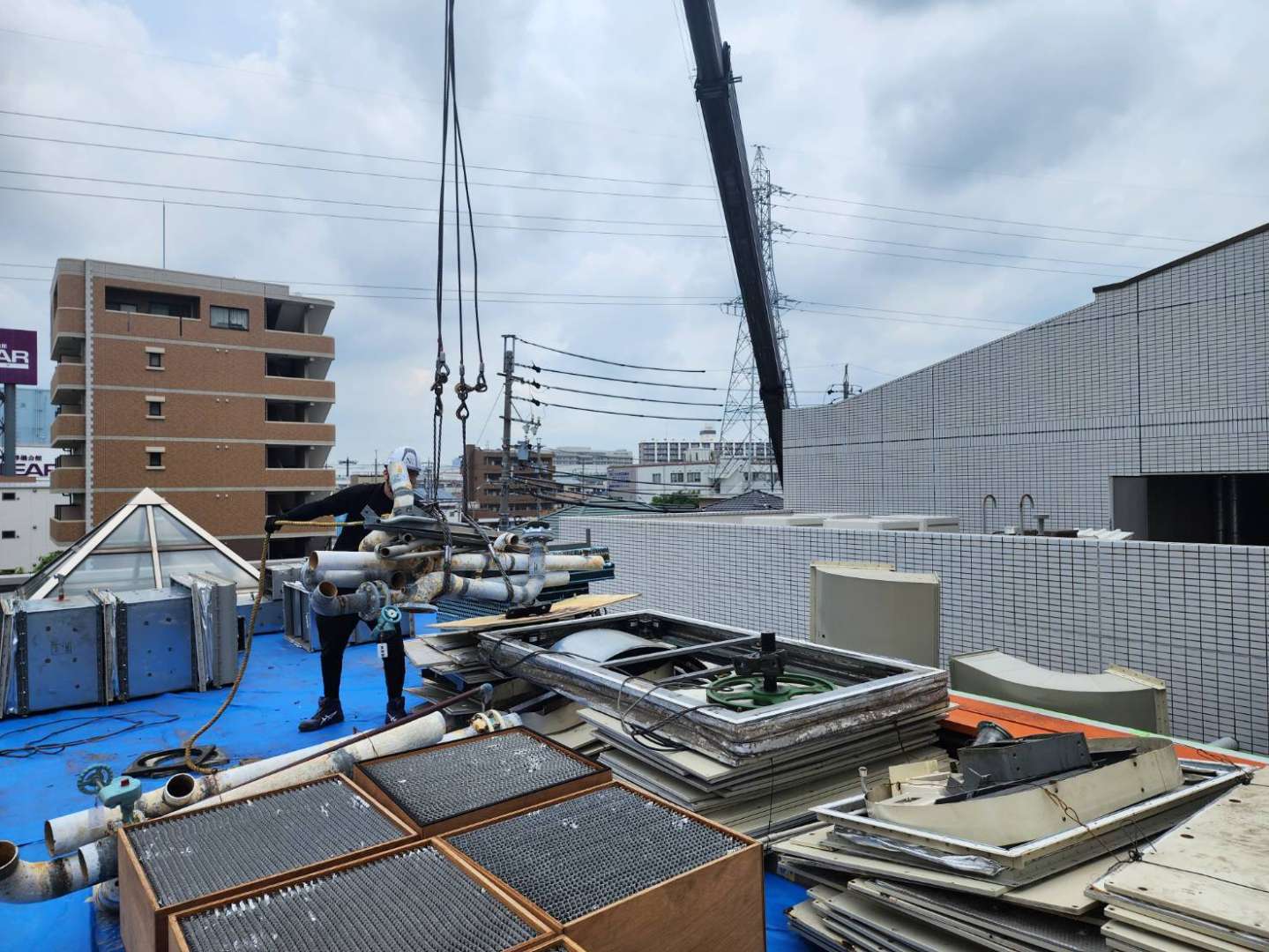 季節の建物の機器解体とあって、周辺には可動している機器、電気盤等もあり、それらを破損させないように、周囲の確認の徹底、養生も行い、作業前に作業者全員で確認、周知をして作業を、行いました。